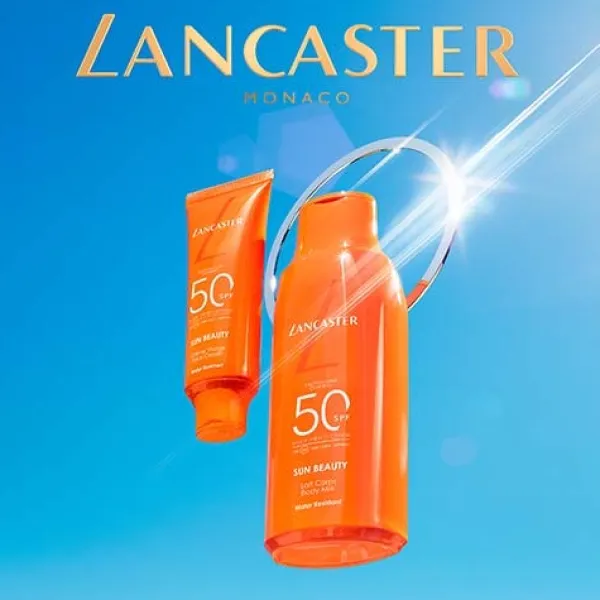Protege tu piel más allá del cuidado tradicional contra los rayos UV con la leche corporal SPF50 Sun Beauty de Lancaster, n.º 1 en protección solar de prestigio en Europa1.