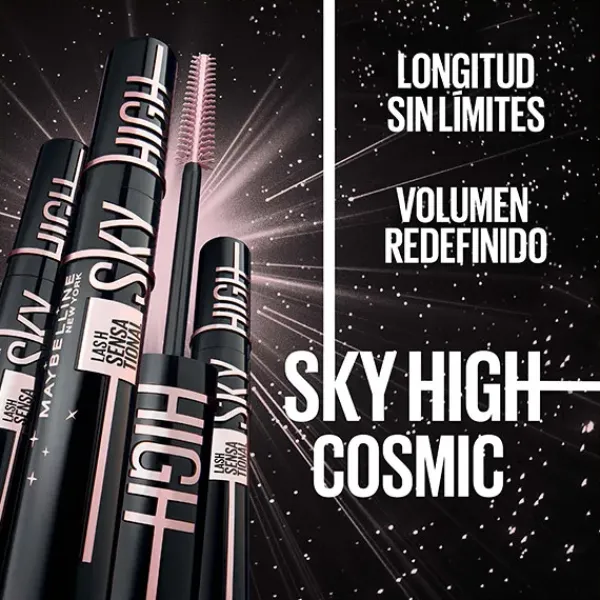Máscara de pestañas Lash Sensational Sky High Cosmic para una longitud sin límites + volumen redefinido en tus pestañas.