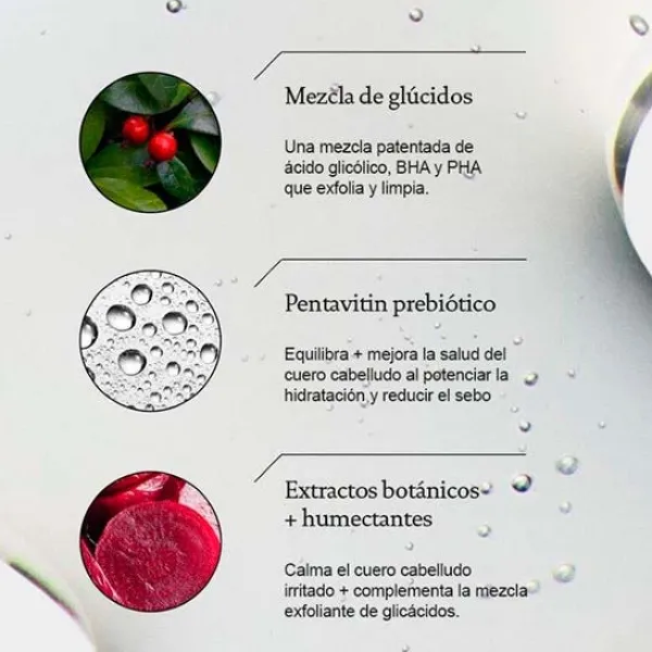 Exfolia suavemente para eliminar células muertas, impurezas y acumulaciones, favoreciendo un cuero cabelludo más saludable.