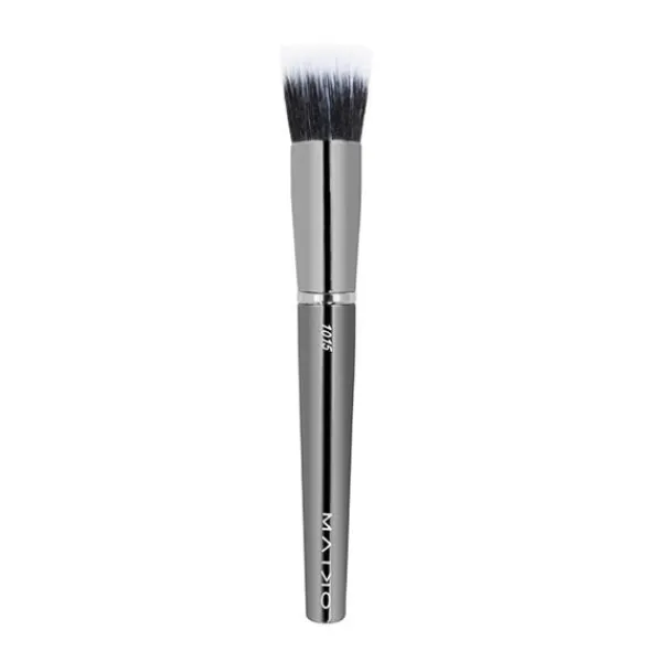 Brocha redonda, de doble fibra de corte plano, y pelo corto, ideal para la aplicación suave y fácil de bases de maquillaje y productos en polvo.