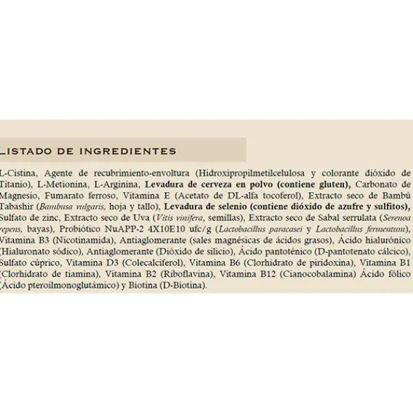 Complemento alimenticio a base de aminoácidos, levadura de cerveza, vitaminas y minerales.