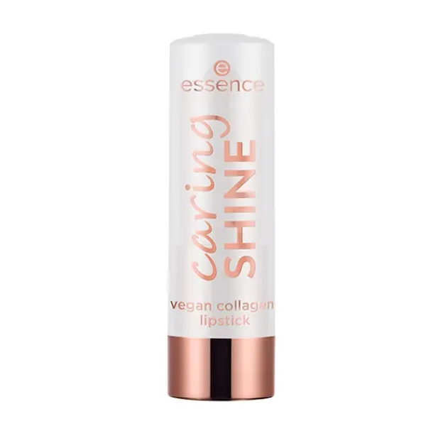 La barra de labios de colágeno vegano caring SHINE está enriquecida con ácido hialurónico y con un sustituto vegano del colágeno.