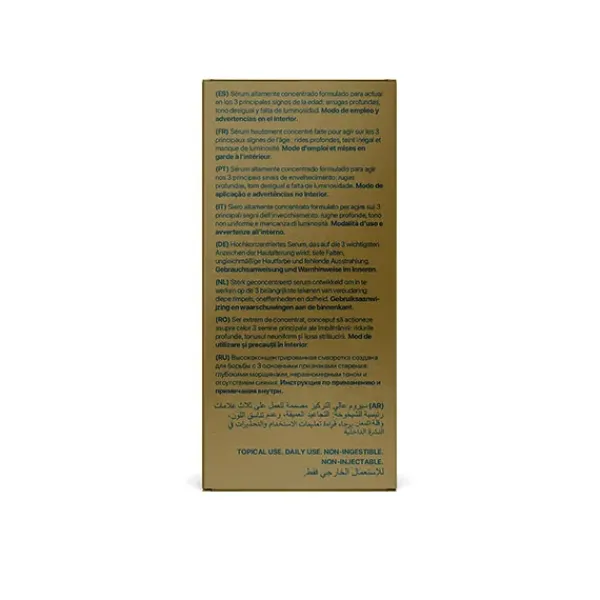 Sérum altamente concentrado formulado para actuar en los 3 principales signos de la edad: arrugas profundas, tono desigual y falta de luminosidad.