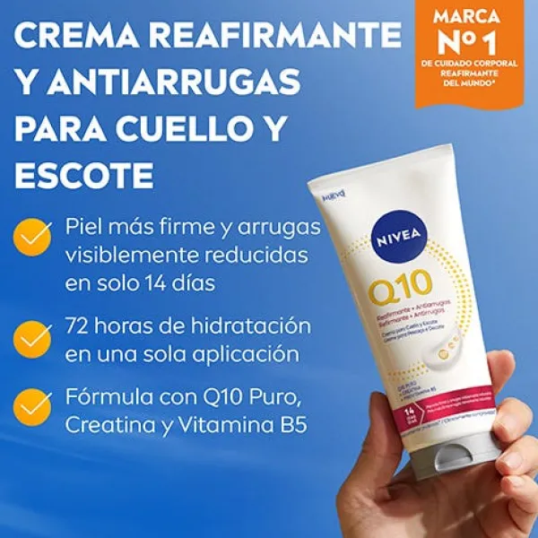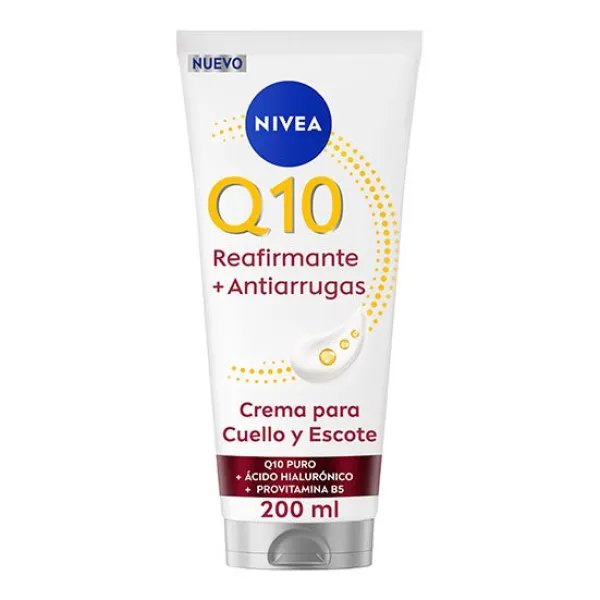NIVEA Q10 Crema para Cuello y Escote Reafirmante y Antiarrugas clínicamente probada para reducir la apariencia de las arrugas en cuello y escote. Su fórmula con Q10 puro, creatina y provitamina B5 está especialmente desarrollada para la piel delicada del cuello y escote. Resultados visibles en días: • En sólo 7 días: 10 de cada 10 mujeres notan la piel más suave y tersa* • En sólo 14 días: reduce la apariencia de líneas finas y arrugas • Con el uso regular mejora la elasticidad de la piel • 72h de hidratación en una sola aplicación Compatibilidad con la piel dermatológicamente probada. **Autoevaluación, 44 mujeres, 2024. Aplicar mañana y noche en cuello y escote. También adecuada para los brazos. Piel más firme y arrugas visiblemente reducidas en 14 días. Con el uso regular mejora la elasticidad de la piel. 72h de hidratación en una sola aplicación. Clínicamente probado NIVEA Q10 Crema Corporal Antiarrugas Cuello y Escote 200ml.