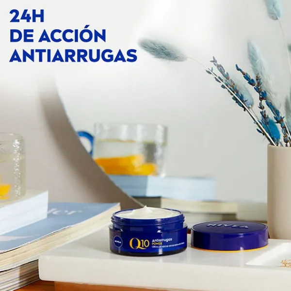 NIVEA Q10 Antiarrugas POWER Crema de Noche reduce visiblemente las arrugas en 4 semanas. Su fórmula contiene la coenzima Q10 más pura de NIVEA® y asegura una acción antiarrugas 24h. Para una piel visiblemente más firme y arrugas reducidas en 7 días. Su innovadora fórmula regenera la piel mientras duermes y estimula la producción de colágeno*. Para una piel firme, con mayor fuerza y elasticidad. Ofrece una corrección visible de las arrugas: reduce 3 tipos de arrugas, las de la frente en un 27%**, las patas de gallo en un 15%** y las de la zona de las mejillas y alrededor de la boca en un 11%**. En tan solo 24 horas nutre intensamente y estimula la regeneración de las células*. En una semana, la piel se vuelve visiblemente más firme en un 23% y las arrugas se ven reducidas**. Mejora continuada˜ y prevención de nuevas arrugas tras 4 semanas. Dermatológicamente comprobado. in-vitro *Estudio de 1 semana con 42 mujeres, 2021 ~Estudio de 4 semanas con 41 mujeres, 2021