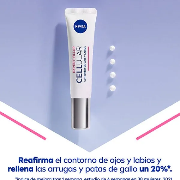 NIVEA Cellular Expert Filler Contorno de Ojos y Labios está enriquecido con Ácido Fólico puro y dos tipos de Ácido Hialurónico, poderosos activos antiedad que aportan un efecto rellenador en 24 horas*. Reafirma el contorno de ojos y labios y rellena las arrugas y líneas de expresión. El Ácido Fólico puro aporta nueva vida a las células de la piel y ayuda a reparar sus fibras*, promoviendo una piel más firme y rellena. Contiene Micro y Macro Ácido Hialurónico, dos ingredientes antiedad conocidos por rellenar las arrugas eficazmente, alisar la piel e hidratar intensamente. Al instante, la piel se siente tonificada. En 1 semana, la zona de los ojos y labios se siente más firme, reduciéndose las arrugas y patas de gallo visiblemente. En 4 semanas, el contorno de ojos se redensifica y rejuvenece. *Testado en células de la piel