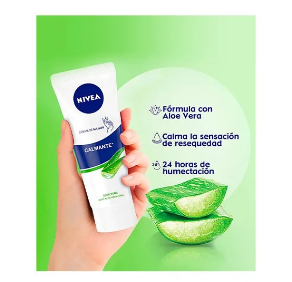¿Necesitas un cuidado que alivie las molestias debidas a la piel seca de tus manos? Prueba la fórmula de rápida absorción de NIVEA Crema de Manos Aloe Vera, que dejará una sensación ligera, refrescante y no grasa en tus manos. Su fórmula con Aloe Vera, ingrediente conocido por sus extraordinarias propiedades calmantes e hidratantes, alivia las molestias de la piel seca de tus manos, dejándolas suaves e hidratadas durante 24 horas. Su práctico formato en tubo de 100 ml permite que lo lleves a cualquier parte en tu bolso, neceser o maleta.