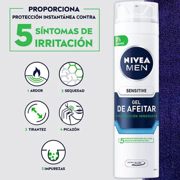 NIVEA MEN Sensitive Gel de Afeitar: protege la piel sensible de la irritación durante el afeitado. Su fórmula extra suave (sin alcohol) enriquecida con Camomila y Hamamelis cuenta con la innovadora tecnología Ultra Glide que asegura un deslizamiento suave de la cuchilla para un afeitado apurado y libre de irritaciones. Prepara la piel sensible para un afeitado comfortable: Sensitive Gel de Afeitar.