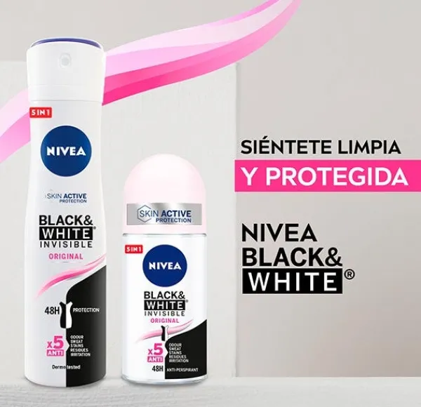 NIVEA Black & White Invisible Original Spray ofrece 48 horas de protección antitranspirante cuidando la piel.