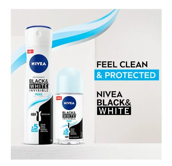 NIVEA Black & White Invisible Active Roll-on: despídete de las manchas de desodorante en tu ropa. Su fórmula ha sido desarrollada con la ayuda de expertos en productos textiles (“Hohenstein International Textile Institute”) con el fin de ofrecer una potente protección anti-transpirante que evita la aparición de manchas blancas en la ropa negra y reduce la aparición de marcas amarillas en tu ropa blanca. Garantiza 48 horas de protección anti-transpirante, con protección antibacterias y con una sutil y femenina fragancia. Su formato roll-on muy eficaz, proporciona máxima suavidad sobre la piel con un aroma duradero: Black & White Invisible Active Roll-on.
