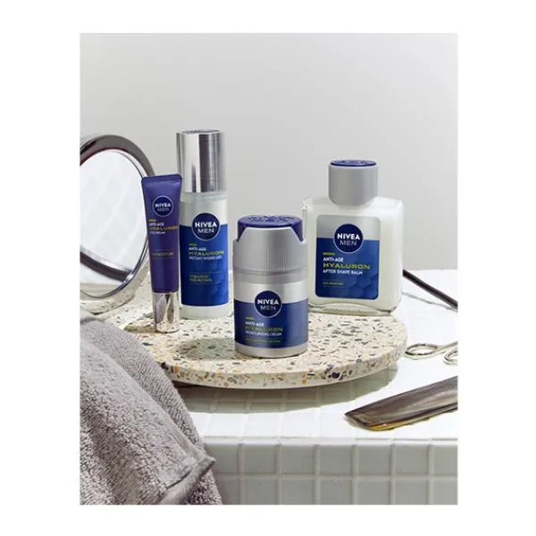 Ayuda a tu piel a combatirlos con NIVEA MEN Hyaluron Bálsamo After Shave Antiedad con Ácido Hialurónico.