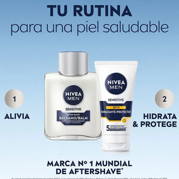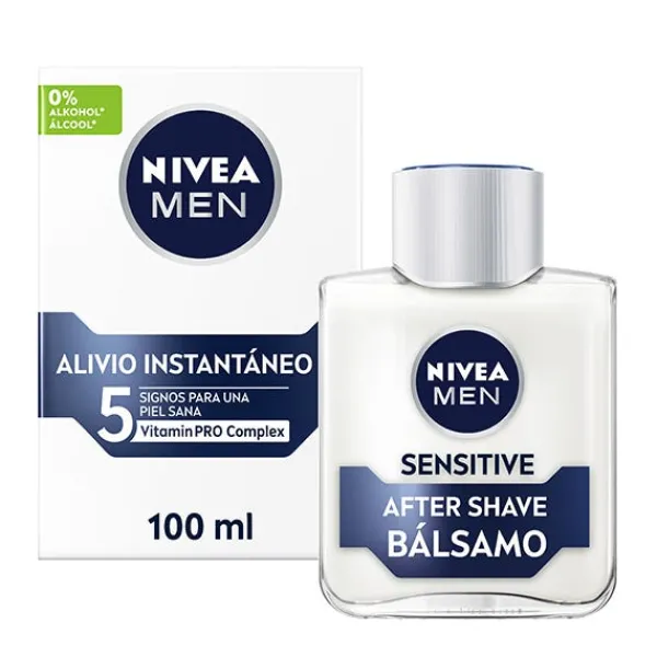 NIVEA MEN Sensitive Bálsamo After Shave: calma inmediatamente la irritación de de la piel de hombres con piel sensible. Su suave fórmula (sin alcohol) enriquecida con Camomila y Hamamelis alivia la irritación y evita la sensación de ardor en la piel tras el afeitado. Para pieles sensibles que buscan una sensación de confort, suavidad y aspecto saludable: Sensitive Bálsamo After Shave.