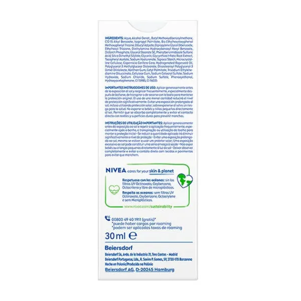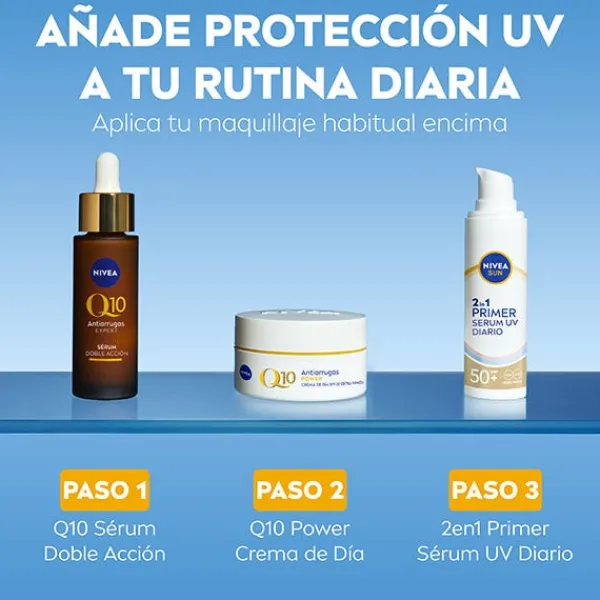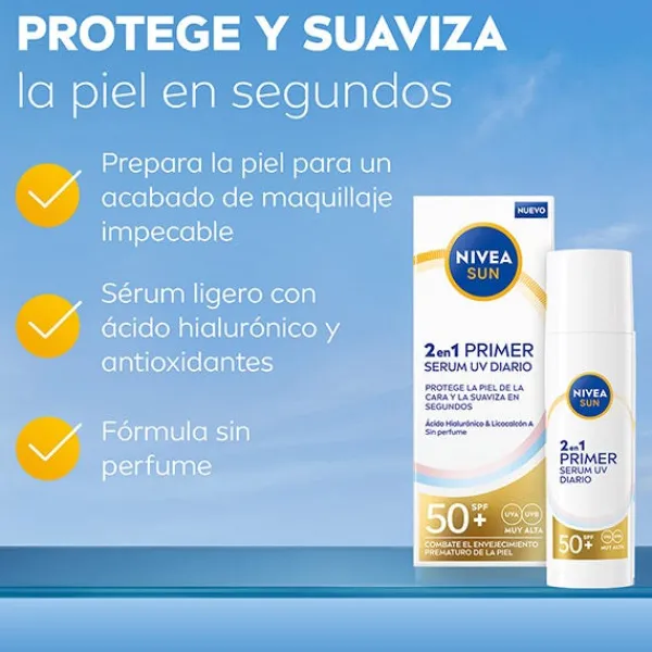 NIVEA SUN Protección facial 2en1 Primer Serum UV Diario SPF 50+ ha sido especialmente desarrollado para proteger y suavizar la piel del rostro en segundos. Alta protección inmediata contra los daños de los rayos UV a corto y largo plazo, como el envejecimiento prematuro de la piel. Este innovador serum ligero está enriquecido con dos tipos de Ácido Hialurónico y con Licocalcón A, un poderoso antioxidante que protege las células de la piel del estrés oxidativo. Mientras que el Ácido Hialurónico de cadena larga hidrata las capas superiores de la piel, el de cadena corta penetra más profundamente y estimula la producción natural de Ácido Hialurónico (in vitro). Es un serum muy ligero, no graso, no pegajoso y que no deja residuos blancos en la piel. Se absorbe inmediatamente y es ideal para uso diario y como base de maquillaje. Adecuado para layering. Acabado invisible en todos los tonos de piel