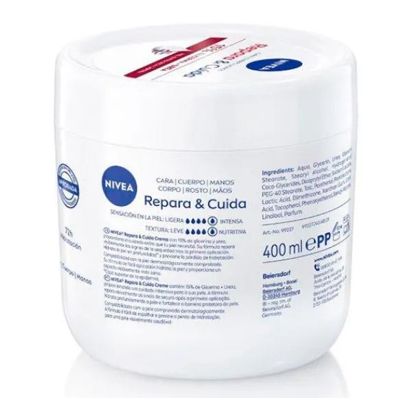 NIVEA Repara y Cuida crema corporal 15% con glicerina + urea para piel extra seca y áspera, su fórmula repara visiblemente los signos de la sequedad tras la primera aplicación, hidrata la piel en profundidad* y previene la pérdida de hidratación. Además, su fórmula de fácil aplicación mantiene la piel hidratada durante 72h y proporciona un aspecto visiblemente más sano. Compatibilidad con la piel dermatológicamente aprobada. *Capa superior de la epidermis. Cuida tu piel con la crema corporal NIVEA Repara y Cuida 15% glicerina + urea.