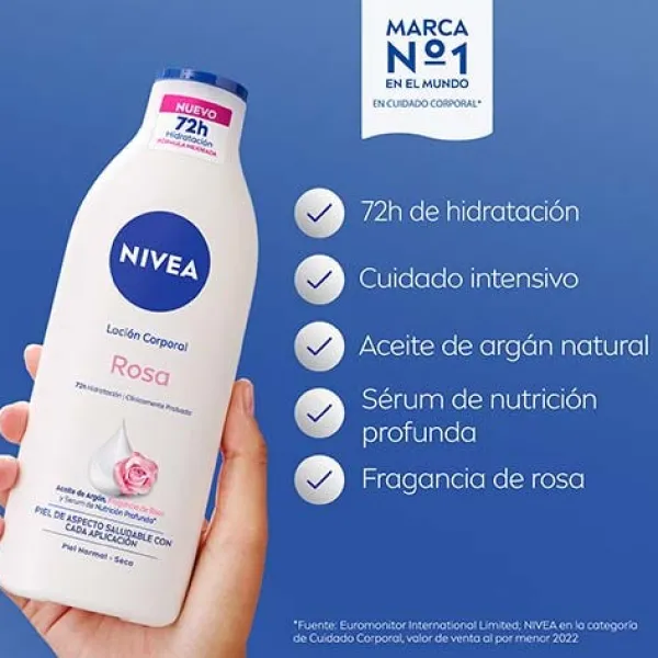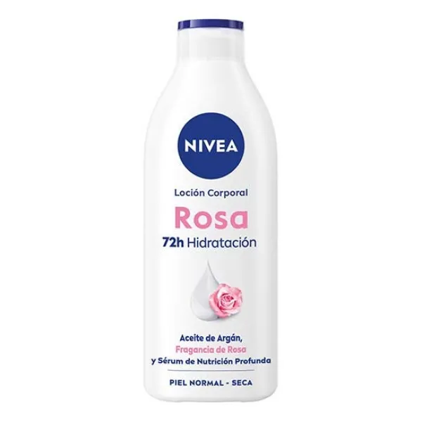 NIVEA Loción Corporal Rosa enriquecida con Serum de Hidratación Profunda, Aceite de Argán y aroma a Rosa aporta a tu piel un Cuidado Completo 5en1. Sus aceites nutritivos, logran ligar y retener el agua en la piel, evitando así que la hidratación pueda evaporarse fácilmente. La piel queda bien protegida de la deshidratación, ya que se reduce la pérdida de agua y aumenta el nivel de hidratación de la piel. Los métodos de test más recientes han demostrado que esta perfecta combinación de ingredientes de alta calidad presentes tanto en el body milk nutritivo como en las demás lociones de NIVEA que incluyen el Serum de Hidratación Profunda, logran penetrar profundamente en la piel, reteniendo el agua en su interior y proporcionando una hidratación profunda durante 48 horas.