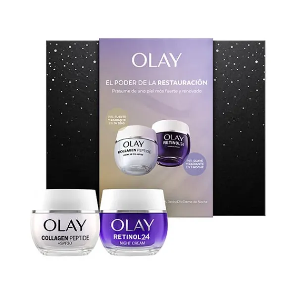 Con este pack de OLAY disfruta de la crema Collagen Peptide24 para una piel visiblemente más fuerte y radiante en 14 días. Contiene péptidos de colágeno que, a diferencia de las moléculas de colágeno, pueden penetrar hasta 10 capas bajo la superficie de la piel. Y la crema Retinol24 hidratante de noche que penetra profundamente en las capas superficiales de la piel. Notarás mejoras visibles en las líneas de expresión y las arrugas, en la suavidad y la luminosidad de tu piel.