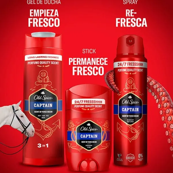 Con tu ambición natural, el mundo caerá rendido a tus pies, y Old Spice Captain te traerá la llave que te abrirá todas las puertas con una fragancia ligera y extrovertida que no sabe lo que significa dar un paso en falso.