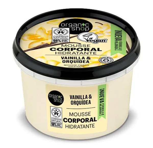 Mousse Corporal Orgánico Bourbon VainillaLa Mousse Corporal Orgánico Bourbon Vainilla está elaborada con extracto de vainilla orgánica y orquídea que con su textura ligera dota a tu piel de suavidad y brillo acompañados de un olor dulce y agradable. Tu piel quedará hidratada al instante de la manera más natural, ya que la mousse no contiene parabenos ni siliconas.El mejor aroma con el que hidratar tu piel