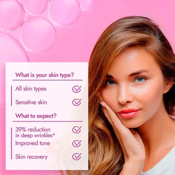 Adecuado para todos los signos del envejecimiento: falta de elasticidad, arrugas y tono de piel desigual.