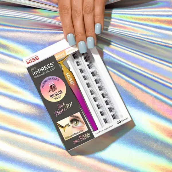 ¿La mirada perfecta en un solo paso? Es posible con las imPRESS Falsies Cluster de KISS, que revolucionan por completo su juego de pestañas gracias a la tecnología de preadhesión: Un adhesivo sensible a la presión ya está adherido a las pestañas artificiales, que se adhieren inmediatamente cuando se pegan a la línea de las pestañas naturales y después ¡hasta 24 horas!