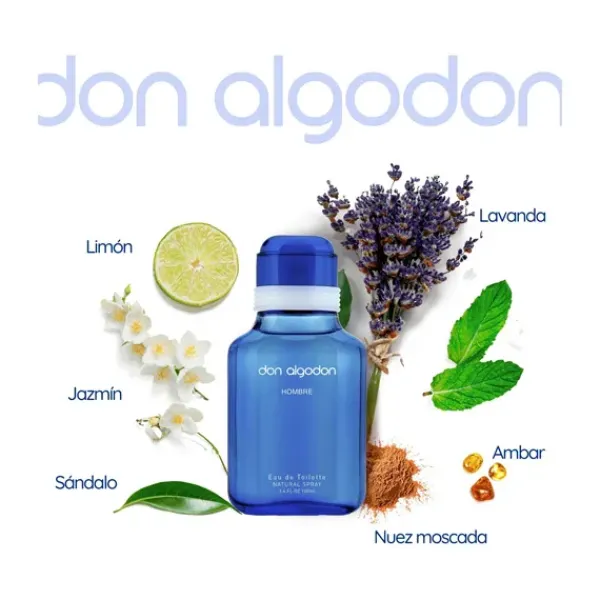 · Eau de Toilette 100 ml: La fragancia emblemática de Don Algodón para hombre, con notas frescas, cítricas y un fondo amaderado, que te envuelve en un aroma vibrante y enigmático.