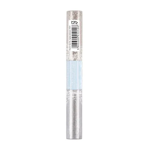 Un producto 2 en 1: un delineador de ojos con purpurina que proporciona un efecto de brillo multidimensional, y una sombra de ojos plateada de textura cremosa.
