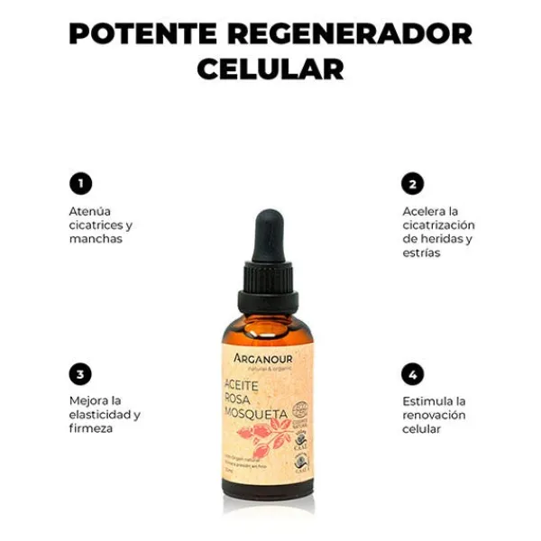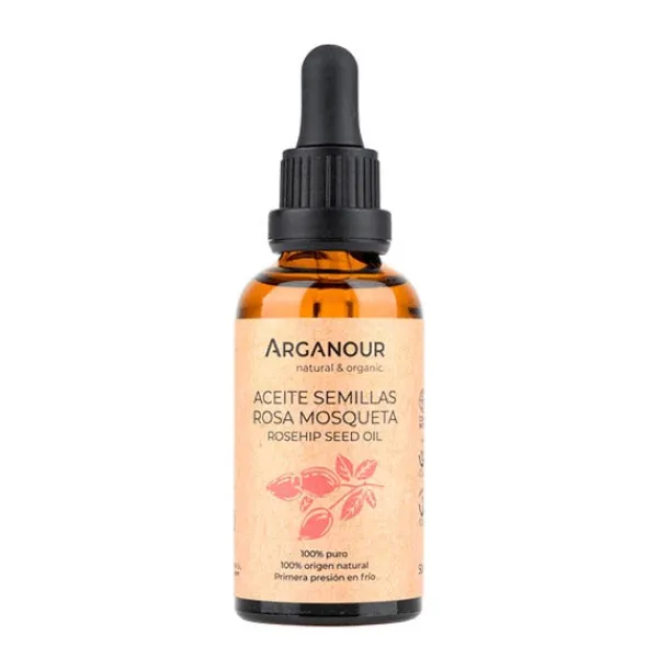 Aceite de semillas de rosa mosqueta 100% puro de Arganour, obtenido por primera presión en frío, contiene altas concentraciones en ácidos grasos esenciales.