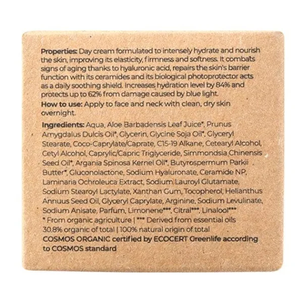 Crema facial de día con factor de protección 15 a base de aceite de argán y almendras, manteca de Karité, Ácido Hialurónico y Colágeno.