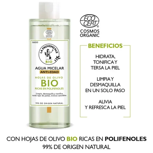 Enriquecida con extracto de hojas de olivo BIO, rico en polifenoles, el Agua micelar antiedad de la Provençale Bio limpia y tonifica la piel sin resecarla, eliminando suavemente impurezas y restos de maquillaje de rostro, ojos y labios.