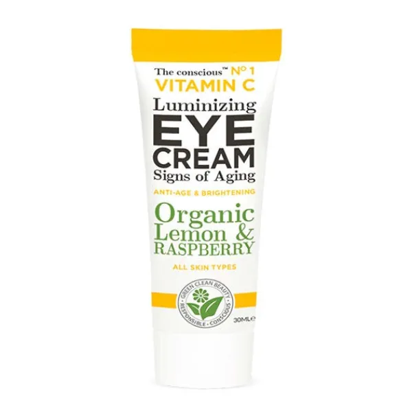 The conscious crema contorno de ojos luminosa antienvejecimiento con vitamina C, aceite de limón orgánico y hojas de frambuesa, hidrata y calma instantáneamente el contorno de ojos, la hinchazón y las arrugas alrededor de los ojos para lograr un cutis uniforme y un brillo más joven.