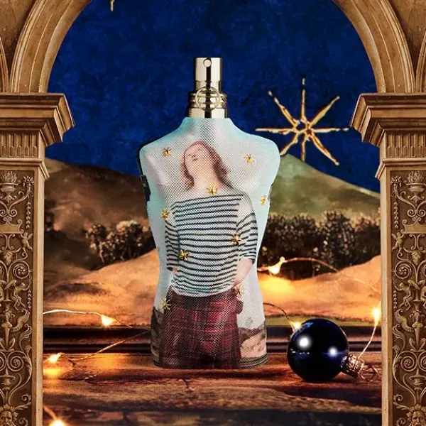 En un marco dorado digno de las obras maestras del Renacimiento, los Collectors de Navidad reviven el Nacimiento de Venus de Botticelli y el San Sebastián de El Perugino con un toque atrevido y moderno. Classique, una diosa con un atrevido corsé, y Le Male, un héroe rebelde con falda escocesa y traje de marinero, se preparan para asombrar a la galería con sus prendas de punto calado estampadas con motivos artísticos. Sobre un fondo de estrellas y rayas, la pareja de culto prepara el escenario para unas fiestas Gaultier inesperadas, teñidas de elegancia y libertad.