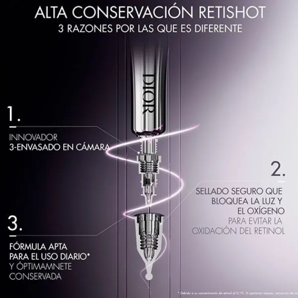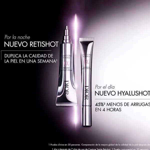 El concentrado de noche Capture Totale Retishot con retinol es la primera solución intensiva de Dior que corrige 6 problemas de la calidad de la piel vinculados a la edad: visibilidad de los poros, tez apagada, rugosidades, irregularidades, imperfecciones y marcas producidas por el sol o el acné.