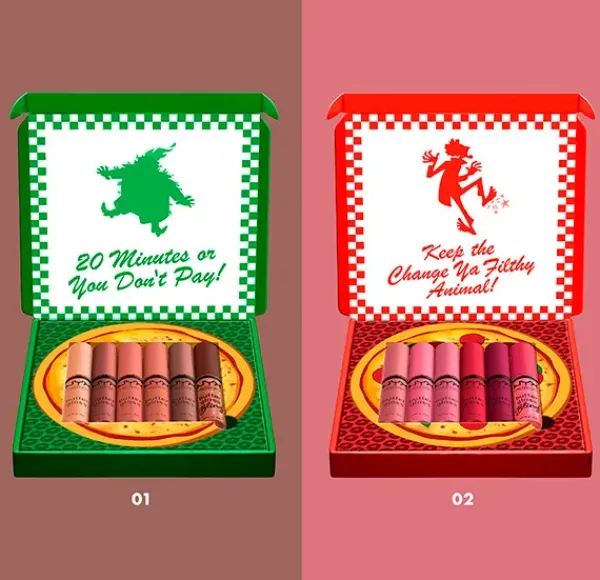 Estos brillos de labios son suaves como la mantequilla y proporcionan un acabado brillante que deja los labios suaves y voluminosos, sin pegajosidad. Cada brillo de labios se desliza fácilmente y ofrece un efecto de volumen sin apelmazar los labios. Pero no solo su contenido es impresionante; el set viene en una divertida caja de pizza verde, inspirada en la clásica película navideña Kevin – Solo en casa.
