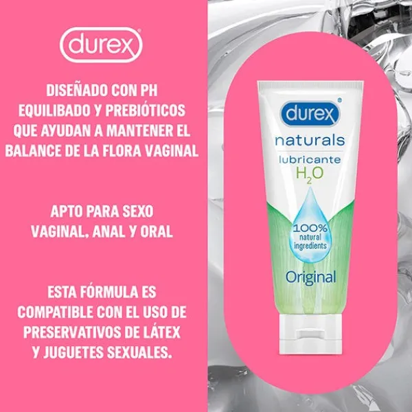 Durex Naturals Gel Lubricante contiene pre-bióticos que ayudan a mantener el equilibro de la flora vaginal y regulan su PH.