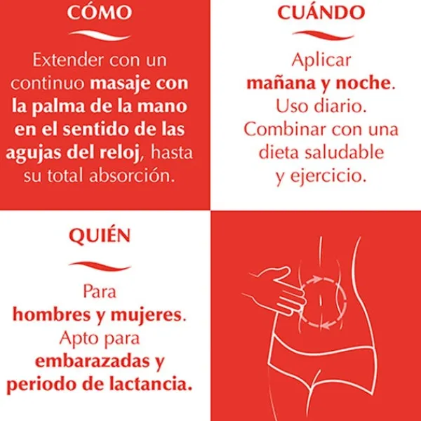 Reafirmar y tonificar la piel, estimula la síntesis de colágeno y mejora la microcirculación, consiguiendo definir la forma del vientre.