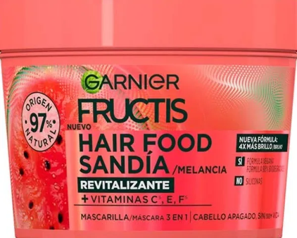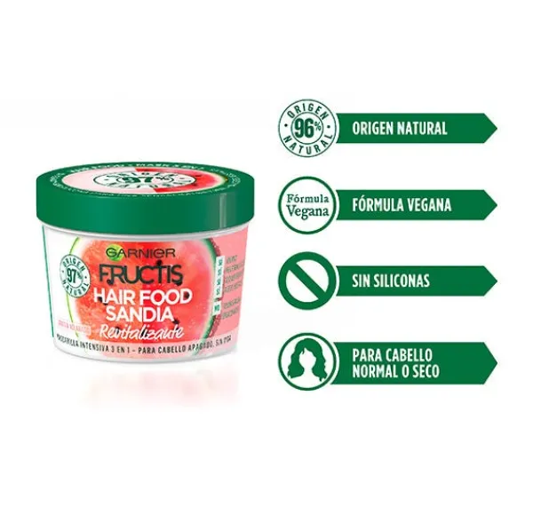 Descubre la nueva mascarilla sin siliconas* Hair Food Sandía: el poder revitalizante de la sandía para decir adiós al pelo apagado, sin vida. Enriquecido con extracto de sandía, este Hair Food es perfecto para las necesidades de los pelos más exigentes. Con una textura cremosa, suave y deliciosa y una fórmula repleta de nutrientes e hidratación para un cabello apagado que necesita un extra de vida.