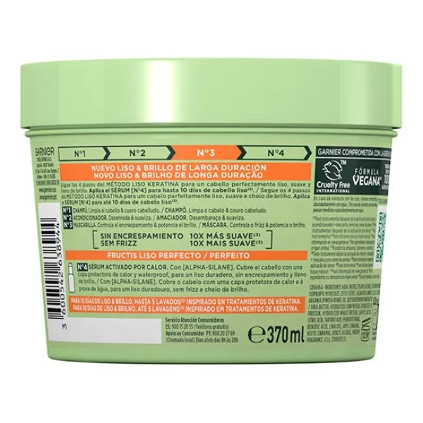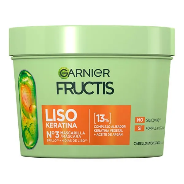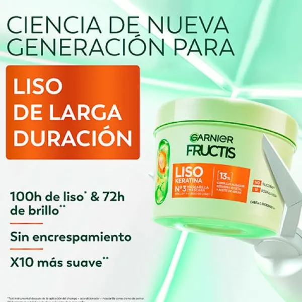 Consigue un pelo con brillo(1) y 4 días de liso(1). La mascarilla Liso Keratina controla el encrespamiento & potencia el brillo, sin siliconas(4) y con su fórmula vegana(6).