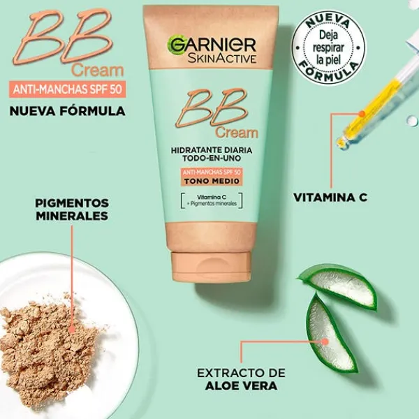 La BB Cream Anti-manchas SPF50 de Garnier es un cuidado que presenta una tecnología todo-en-uno: gracias a la glicerina de origen vegetal hidrata intensamente, los pigmentos minerales unifican nuestra piel y la vitamina E posee poder antioxidante, combinando así todos los pasos de belleza en un solo gesto, y ofreciéndote además un cuidado a largo plazo gracias a su protección solar.