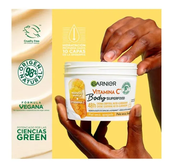 La crema corporal Garnier Body Superfood Mango + Vitamina C proporciona 48h de máxima hidratación y luminosidad a pieles secas y apagadas.