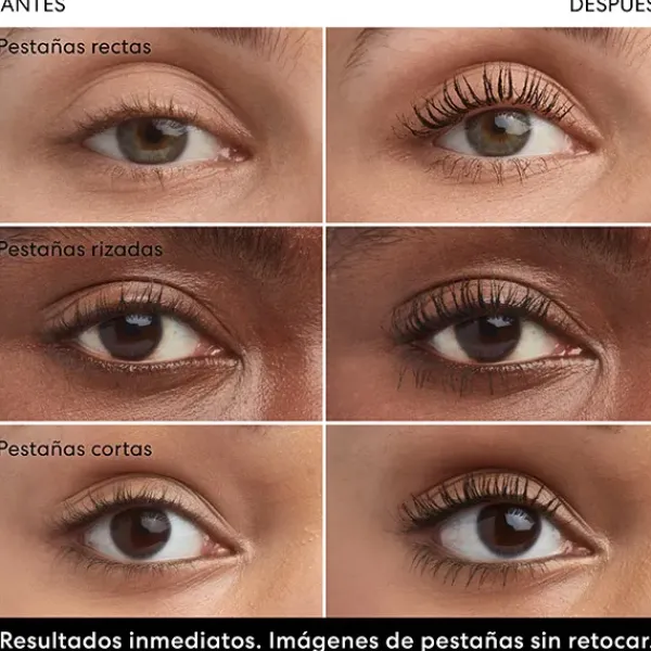 • Con fibras de cáscara de naranja recicladas que se adhieren a las pestañas para conseguir un volumen instantáneo