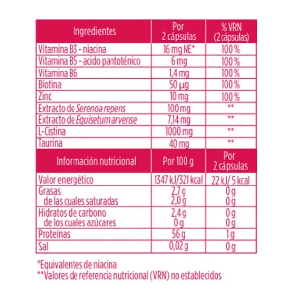 Estas cápsulas ayudan a mantener el buen estado del cabello gracias a la L-cistina (aminoácido que forma parte de la estructura del pelo), Taurina, Silicio, Zinc y Biotina, a evitar la regresión de los folículos pilosos y contribuye a reducir la secreción sebácea gracias a la Serenoa Repens.