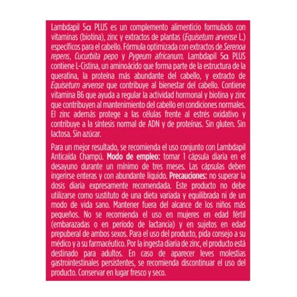 Alimenta tu cabello desde el interior. Lambdapil 5α Plus cápsulas es un complemento alimenticio formulado con Serenoa repens, Cucurbita pepo y Pygeum africanum, extractos de plantas específicos para el cabello. Además, su fórmula incluye también vitaminas del grupo B (como Biotina), Zinc, L-Cistina y extracto de Equisetum arvense.