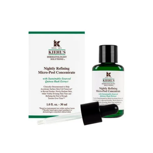 El exfoliante facial de noche Nightly Refining Micro-Peel Concentrate de Kiehl's ayuda a afinar la piel con textura áspera y devuelve una piel fresca y con un nuevo brillo.