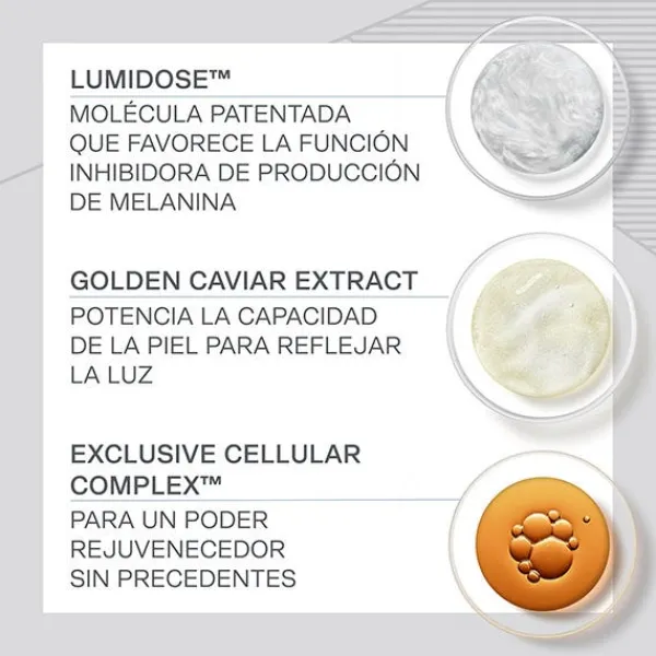 La crema La Prairie White Caviar Crème Extraordinaire contiene la exclusiva molécula patentada Lumidose, elegida entre 50.000 ingredientes por ser la más efectiva en inhibir la producción de melanina, lo que le permite iluminar la piel y reducir las manchas causadas por el envejecimiento.