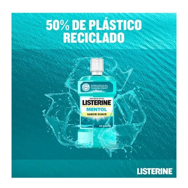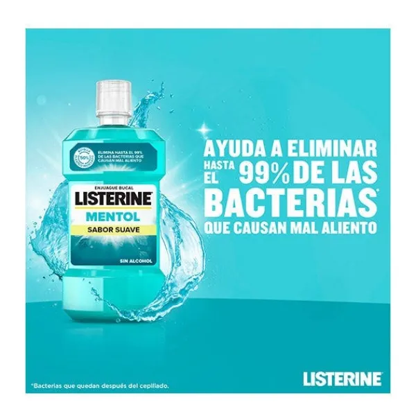 Gracias a su fórmula basada en aceites esenciales con flúor y sin alcohol, el enjuague bucal Mentol Suave proporciona 24 horas de protección contra la placa y la tranquilidad de un aliento fresco duradero.