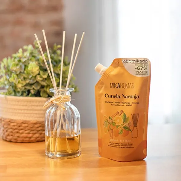 EKOMIKADO es una recarga de ambientador mikado en un formato innovador, una bolsa doypack que reduce el consumo de plástico y la huella de carbono frente a otras opciones tradicionales como los formatos de reposición en botella de plástico. Es una respuesta a tu compromiso, y el nuestro, con el consumo responsable. Permite utilizar un envase a tu elección para colocar la fragancia y está disponible en nuestros 4 aromas más vendidos.