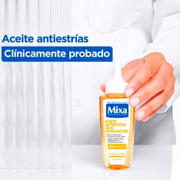 El nuevo Aceite Antiestrías Mixa, con un 30% de Omega 6 y 9, reduce un 33% el color de las estrías*. Su fórmula es adecuada para el postparto, con un acabado no graso. *Autoevaluación en 43 sujetos después de 8 semanas.