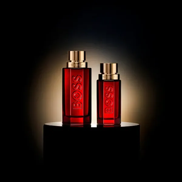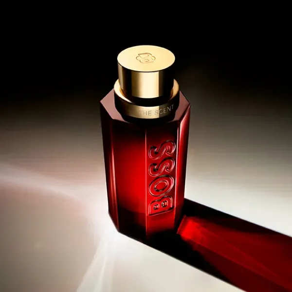 El icónico frasco BOSS The Scent se viste con el mismo vidrio lacado rojo intenso que su fragancia masculina homóloga, reflejando la intensidad del aroma seductor que contiene. El frasco se corona con un tapón dorado cálido con un lujoso acabado satinado, que refleja los detalles metálicos resplandecientes en el embalaje exterior.