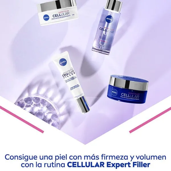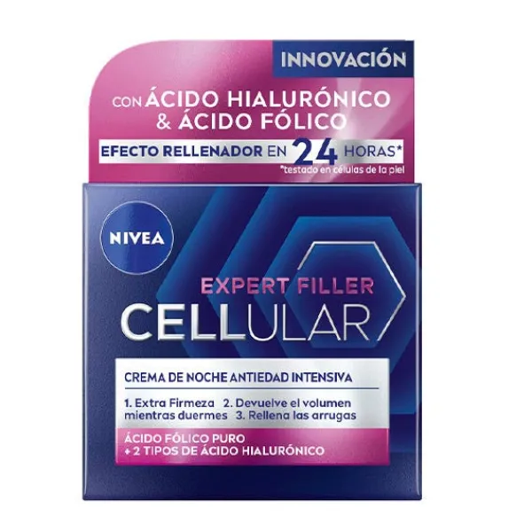 NIVEA Cellular Expert Filler Crema de Noche contiene Ácido Hialurónico & Ácido Fólico, para un efecto rellenador en 24 horas*. Aporta extra firmeza, devuelve el volumen mientras duermes y rellena las arrugas. El Ácido Fólico puro aporta nueva vida a las células de la piel y ayuda a reparar sus fibras*, promoviendo una piel más firme y rellena. Los dos tipos de Ácido Hialurónico, Micro y Macro, rellenan las arrugas eficazmente, alisan la piel e hidratan intensamente. En 1 semana, mejora la firmeza y el volumen de la piel notablemente. En 2 semanas, las arrugas se rellenan visiblemente y la piel se siente descansada al día siguiente. En 4 semanas, el rostro se ve rejuvenecido y la barrera de la piel se refuerza para ayudar a luchar contra los signos de envejecimiento. *Testado en células de la piel.