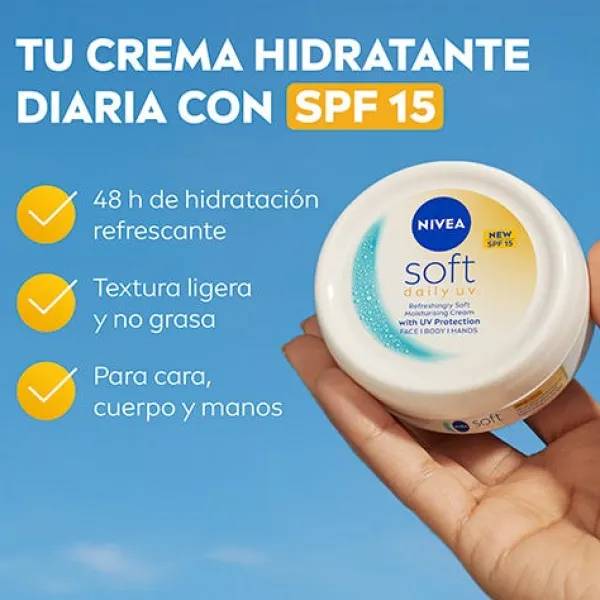NIVEA Soft Crema Hidratante Multiuso UV diario SPF15 100ml es una crema hidratante refrescante y suave que combina la hidratación diaria con una protección UV para una piel sana y luminosa.